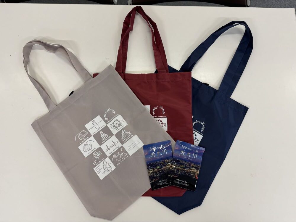 自転車返却後は、今後のサービス向上や観光促進に向けた参考とするため、簡単なWebアンケートへのご協力をお願いします。若松北海岸周遊レンタサイクル(電動アシスト自転車)利用者で、アンケートにご回答いただいた方には、北九州市の夜景をモチーフにしたオリジナルグッズ(エコバッグまたは入浴剤)をプレゼント!