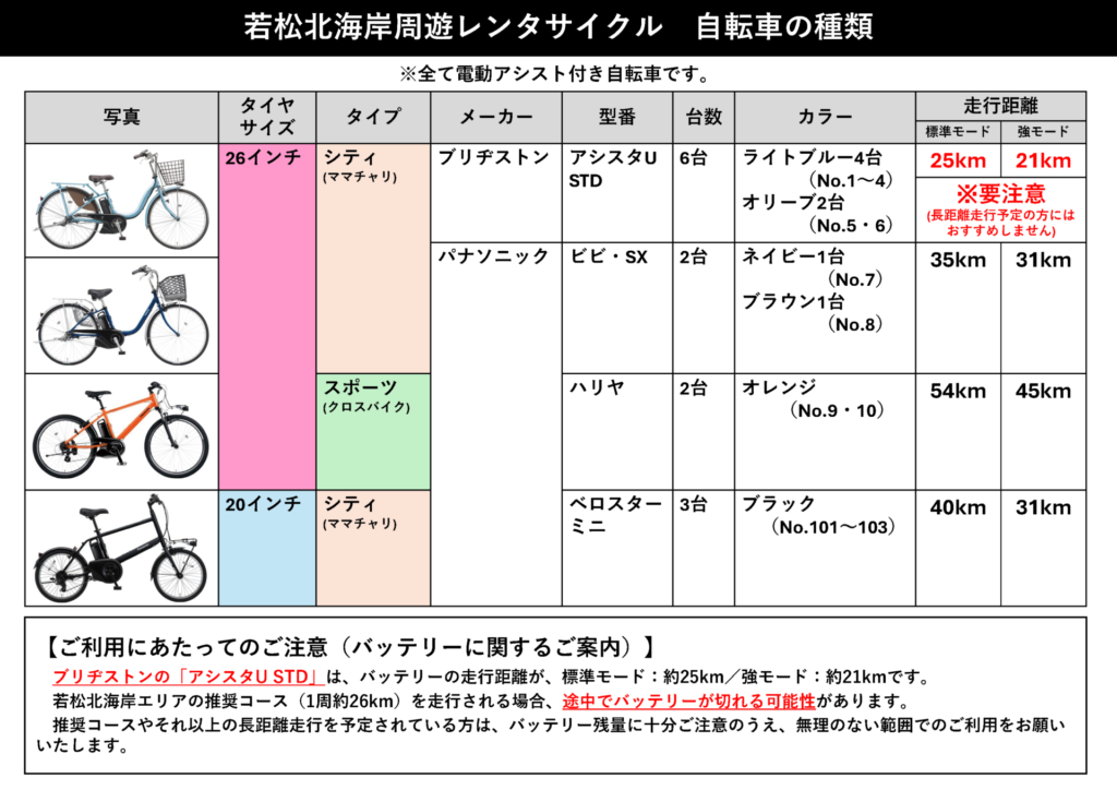 若松北海岸周遊コース(※推奨ルートマップ参照)に出られるのは、新たに導入する電動アシスト自転車(3時間利用・1日利用)のみ です。従来の自転車ならびに1時間利用は、頓田貯水池コース(外まわり・内まわり)専用となりますので、ご注意ください。