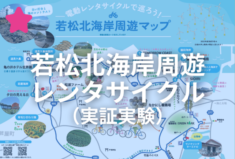 イベント詳細 日付: 2025年5月31日 9:00 AM – 12月25日 5:00 PM 【頓田貯水池コース(内まわり・外まわり)限定】電動アシスト自転車/1時間利用 利用期間延長決定! 1時間500円 … 続きを読む 【1時間利用の期間延長決定】若松北海岸周遊レンタサイクル(実証実験)