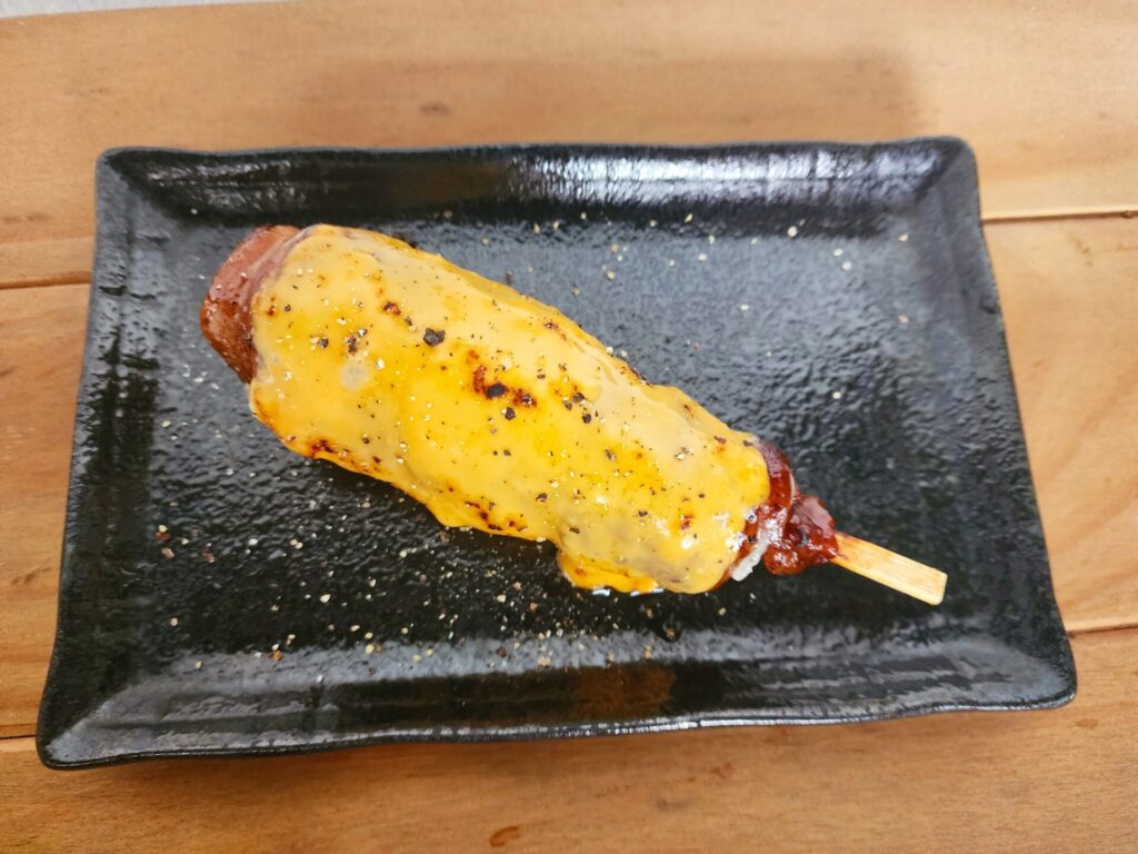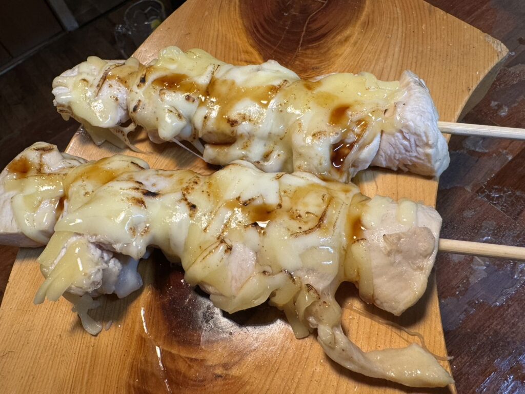 店舗でも隠れた人気「国産鳥のムネ肉」を大胆に串うちしてわらいば特製タレにさらにチーズをどさっと盛りとろけるまで炙った絶品商品です