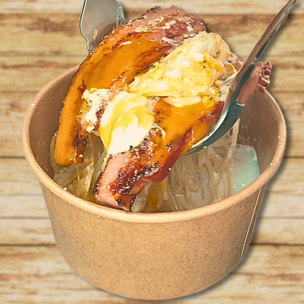 醤油ベースのガイ・ヤーンをチーズと特製オリジナルサルサソースで仕上げた丼ぶりです。