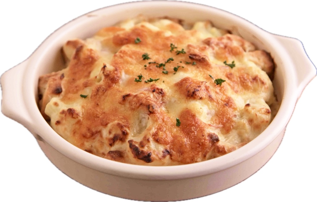 ホワイトソースのマカロニグラタンにアクセントとしてマッシュドポテトを入れてます。