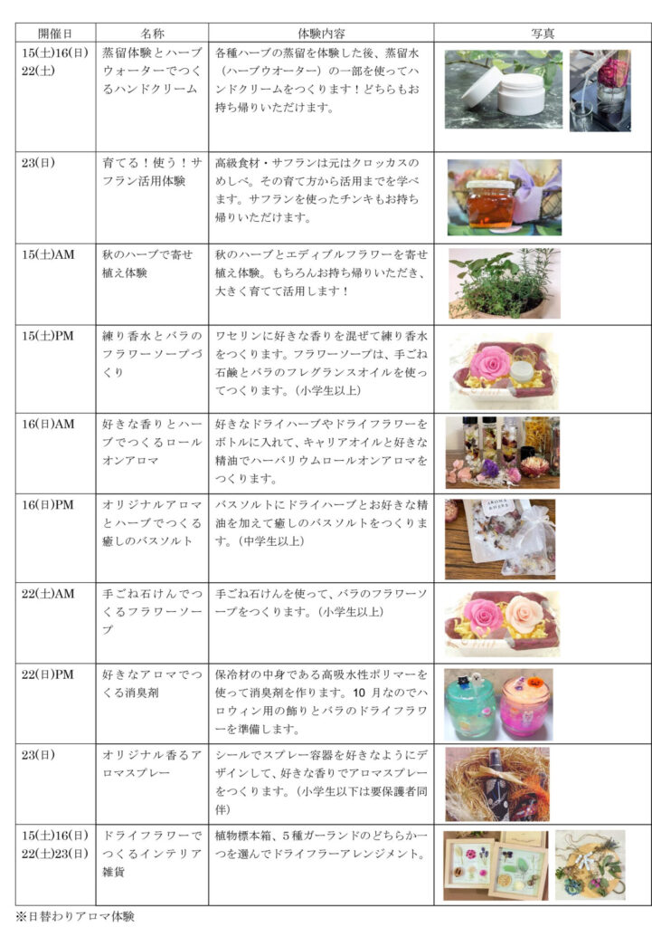 ハーブの蒸留体験、アロマ体験各種、草花の寄せ植え、ドライフラワーアレンジメントの基本テーマは同じですが、それぞれ趣向を凝らしてパワーアップ。高級食材・サフランを使ったワークショップも追加しました。
