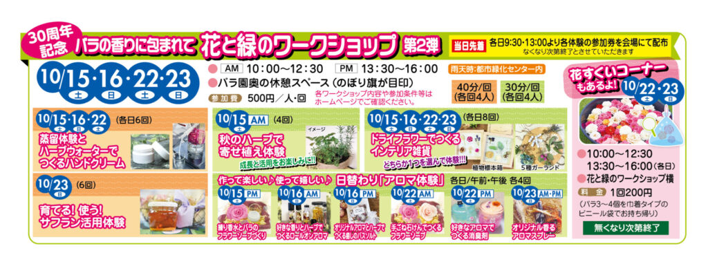 開催場所は、バラ園のずーっと奥の休憩スペース(雨天・強風時は都市緑化センター内)。参加料はワンコインの500円(材料費も含みます)。当日、9時半、13時より当日開催の各ワークショップの参加券を開催場所にて販売します。