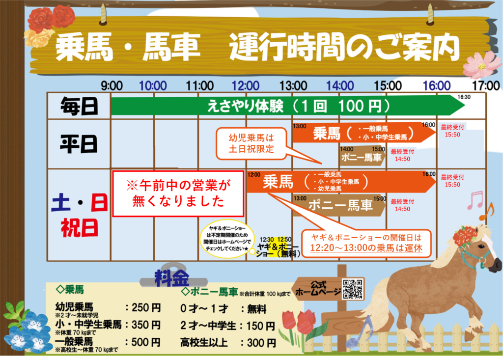 | 乗馬 (体重70kg以下) | 12:30~15:30(15:20最終受付) ※幼児乗馬(2歳~未就学児対象)は休止中 |