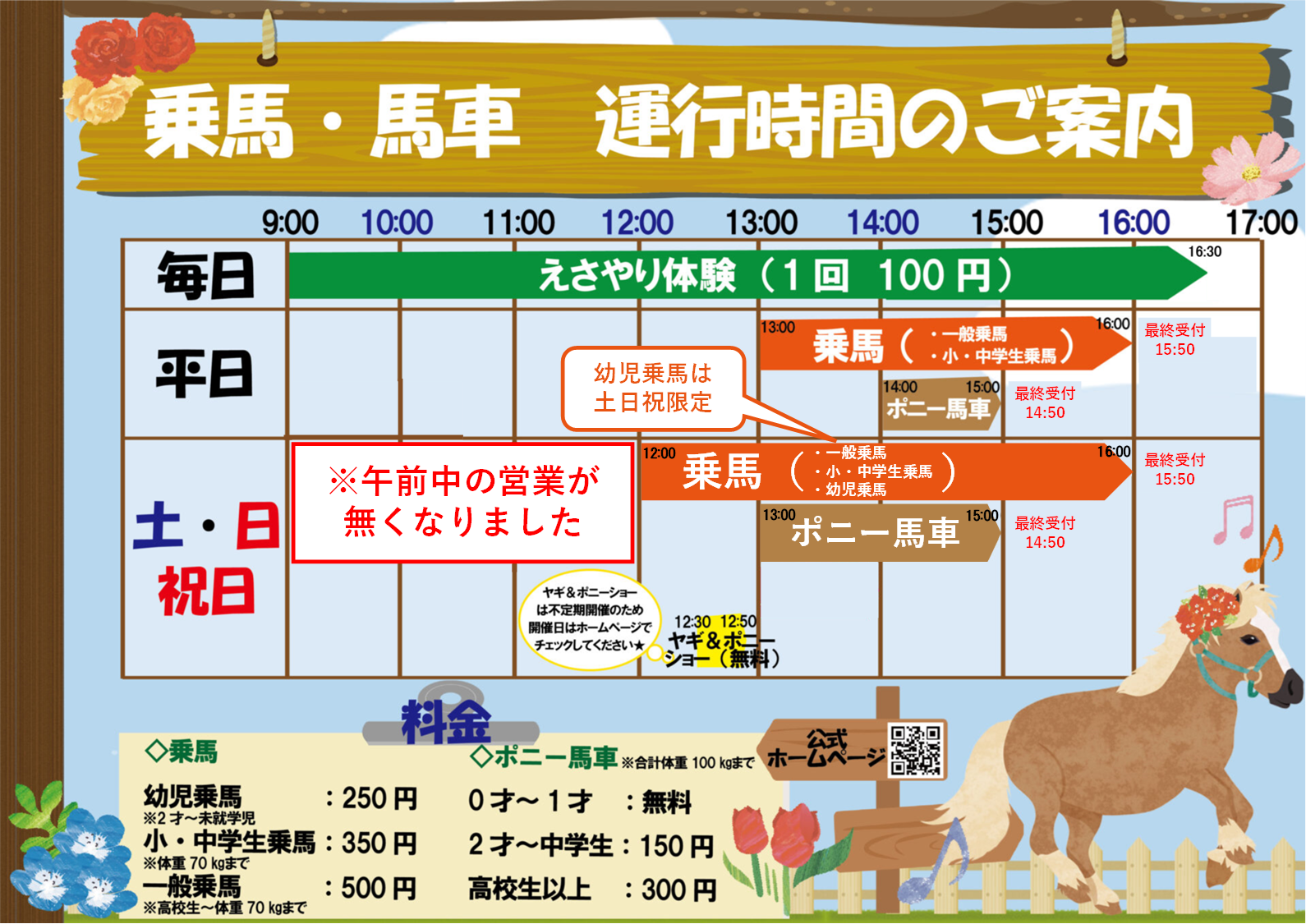 | ポニー馬車 | 14:00~15:00(14:50最終受付) |