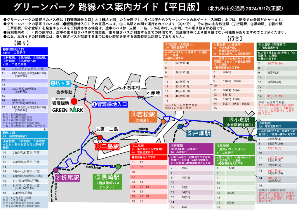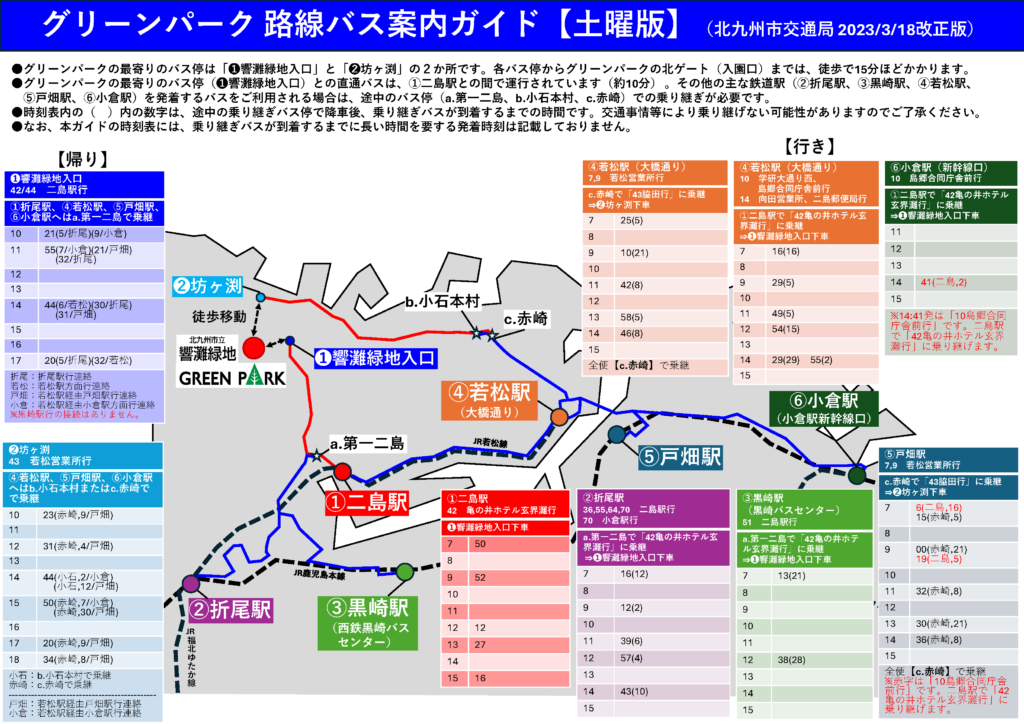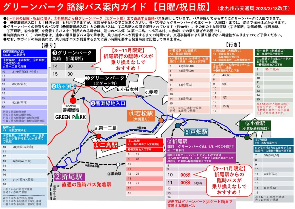 3月~11月の季節限定で、JR折尾駅(5番のりば)からグリーンパーク北ゲート前まで直通する臨時バスを、1日2往復運行しています。