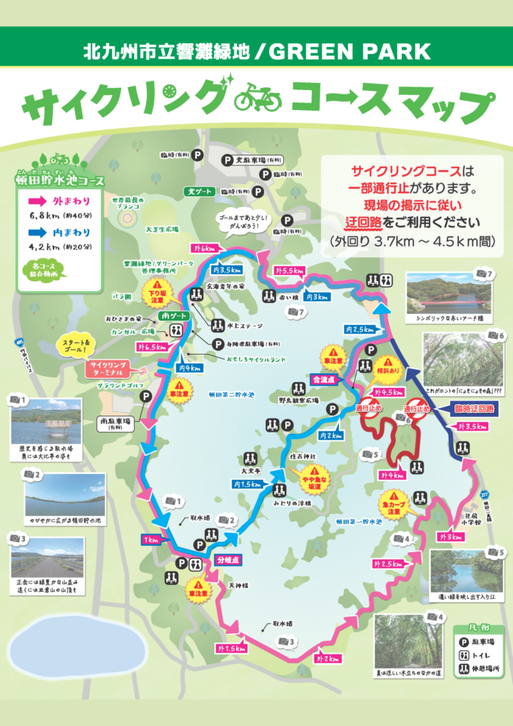 TOP>重要なお知らせ>サイクリングコース(外まわり) 一部区間通行止めのお知らせ お知らせ 響灘緑地 GREEN PARKからのお知らせを掲載しています。 イベント情報なども随時掲載中です。 重要なお知らせお知らせ 2025.08.20 サイクリングコース(外まわり) 一部区間通行止めのお知らせ いつもグリーンパークをご利用いただきありがとうございます。 サイクリングコース(外まわり)につきまして、8月9日(土)から10日(日)にかけての大雨災害の影響により、現在も一部区間で通行止めが続いております。外まわりコースをご利用の方は、迂回路をご利用くださいますよう、ご協力をお願いいたします。 【通行止め区間】外まわり 3.7km~4.5km間※外まわりコースをご利用の方は、こちらの迂回路マップをご利用ください。 戻る お知らせ一覧を見る