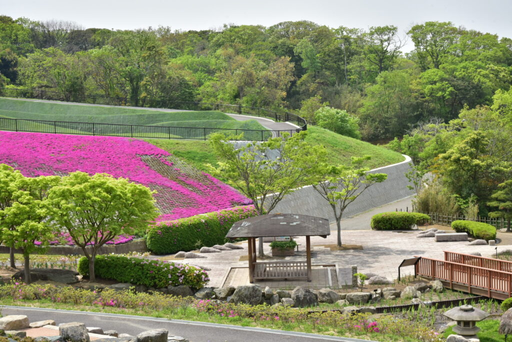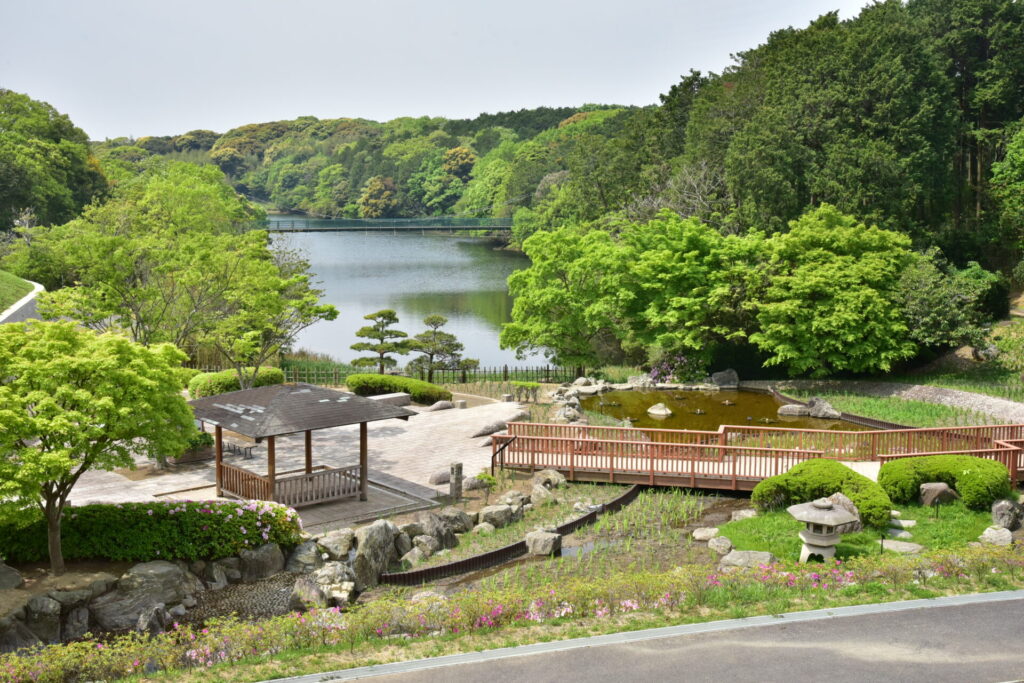 100人ブランコの奥にある日本庭園。花と水辺を楽しめる新しい空間としてリニューアル整備されました。