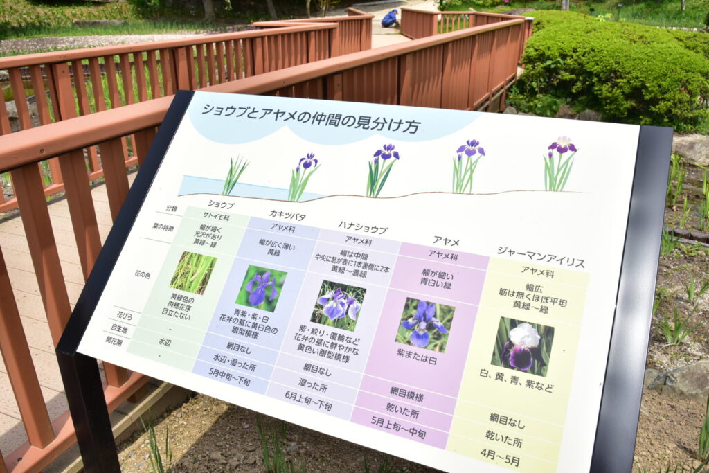 リニューアル整備された日本庭園では、高さや水位に合わせて4種類のショウブとアヤメの仲間が植栽されています。