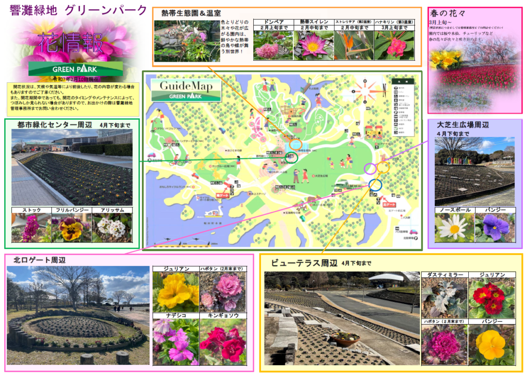 TOP>重要なお知らせ>花情報2月10日号を掲載しました! お知らせ 響灘緑地 GREEN PARKからのお知らせを掲載しています。 イベント情報なども随時掲載中です。 重要なお知らせお知らせ花と緑 2025.02.11 花情報2月10日号を掲載しました! 平素よりグリーンパークのホームページをご覧いただきありがとうございます。 2025年4月下旬までのグリーンパーク園内における花の見頃情報を更新しました!是非ご覧ください。 戻る お知らせ一覧を見る