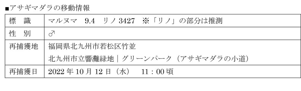 原田さんが撮影した写真をもとにインターネットで調べてみた限りでは、そのアサギマダラは群馬県片品村の丸沼という場所でマーキングされた個体と推察されます。去年も群馬県と長野県でマーキングされた個体を確認しています。